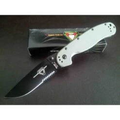 Couteau Ontario Rat 1 OD Green pliant – Longueur fermĂ© 12.70cm – Longueur de lame 8.89cm – Lame en acier AUS-8 – Lame teinte anti reflet – Lame partiellement serrated – Platines en acier – Plaquettes du manche en fibre de nylon OD green – Ouverture d’une main – Système de sĂ©curitĂ© – Clip