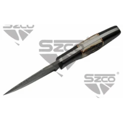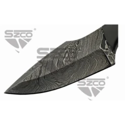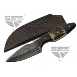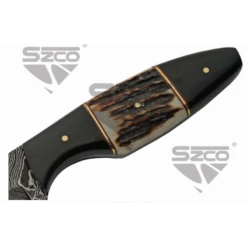 Couteau skinner EDC Damascus Stag & Horn Handle Hunter Knife 256 Layers Blade Leather Sheath Ă lame fixe – Longueur totale 20.32cm – Longueur de lame 9.52cm – Lame en acier damas 256 couches – Construction d’une seule pièce – Full tang – Plaquettes du manche en corne & bois de chevreuil – Rivets & entretoise en laiton – Etui cuir