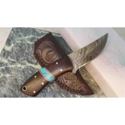 Couteau Skinner Damascus 256 Layers Blade Wood Handle Leather Sheath Ă lame fixe – Longueur totale 15.87cm – Longueur de lame 6.98cm – Construction d’une seule pièce – Full tang – Lame en acier damas 256 couches – Plaquettes du manche en bois – Insert turquoise – Trou dans le manche pour dragonne – Etui cuir