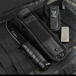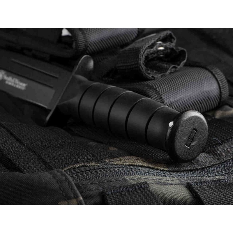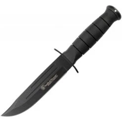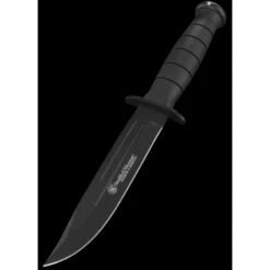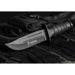 Couteau de Survie Tactical Smith&Wesson Search & Rescue 7Cr17MoV Clip Blade Rubber Handle Nylon Sheath Ă lame fixe – Longueur totale 26.04cm – Longueur de lame 14.61cm – Epaisseur de lame 2.8mm – Lame de type clip point plain edge finition black – Lame en acier 7Cr17MoV – DuretĂ© 57-58HRC – Garde & pommeau en acier – Manche en caouchouc – Etui nylon avec pochette pour pierre Ă affuter