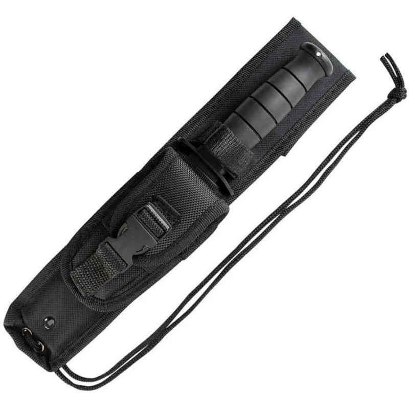 26.04cm overall. 14.61cm black oxide coated 7Cr17MoV stainless clip point blade. Blade Thickness 2.8mm. Black grooved rubber handle. Includes sharpening stone. Black nylon belt sheath. Clam packed.