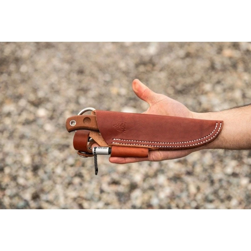 When TOPS started building knives for bushcraft outside of the tactical knives with a survival flair, black traction coating and tan canvas Micarta handles were the option on most. As TOPS has continued to be successful in that arena, many colors and finishes have been offered, but the tan and black color combo remains one of THE classic looks. Enter the Reserve Edition. Like a prized, single-malt, aged scotch, or a top-shelf cigar, the Baja 4.5 Reserve Edition looks every bit as good as those classics and comes with a quality double-stitched brown leather sheath to complete the look. So nice, you’ll want to wear it to your next black-tie affair or maybe just out into the woods. Either way, it’ll look great and get the job done.
