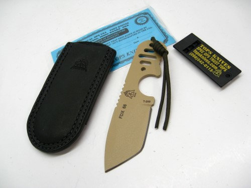 Tops FDX 66 TPFDX66 – 5 7/8″” overall. 2 7/8″” tanto blade. One piece coyote tan finish 1095 high carbon steel construction. Skeletonized handle with index finger cutout. Lanyard hole with OD green nylon cord lanyard and TOPS survival whistle. Embossed black leather belt sheath. Certificate of Authenticity. Bulk packed.