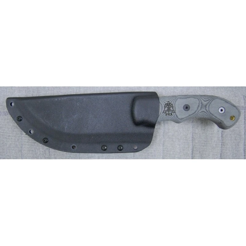 Couteau de Combat Ă lame fixe Tops Tom Brown Tracker – Longueur totale 30.16cm – Lame de 15.87cm – Lame en acier carbone 1095 – Traitement anti reflet – Construit d’une seule pièce – Plaquettes du manche en micarta – Étui clip en Kydex – Fonction machette