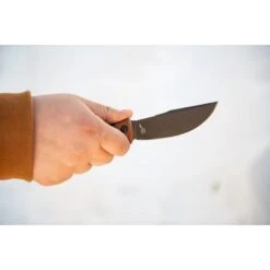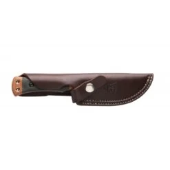 Marble’s ® versions of the woodcraft mostly included stacked leather handles and metal bolsters. Neither of those features are seen on TOPS’ usually. So, Leo’s way of mimicking the look was to use two different colors of Micarta and inset one piece into the other. The TOPS version also includes Midnight Bronze Cerakote as a great compliment to the handle. The sheath was designed to match with the old-school “cowboy” sheaths that had leather cover most of the handle to protect the knife from getting scratched up or snagging while going through thick brush. The dimensions and design are as close to the Marble’s version as possible but bring this knife new life. Still a classic design that is great for hunting, camping, and of course, Woodcraft ® chores.