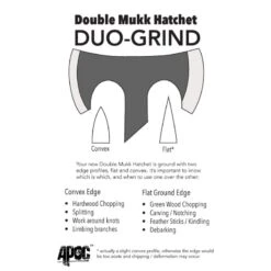 A unique feature of the Double Mukk is the duo-grind – one head is flat ground for carving and fine work while the other has a heavy convex grind for limbing and splitting. The whole hatchet is milled from a single piece of 9260 spring steel that’s tempered to the low 50s HRC (Rockwell hardness). Handle scales are solid milled G10, contoured for comfort with a swell at the end to keep it in your hand.