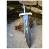 Blade. 15.87cm overall. 9.52cm mirror finish stainless clip point blade. Brass guard. Brown leather belt sheath. Boxed.