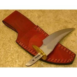 Knife making blade blank. Hidden tang style. Stainless steel blade. Brass guard. File work skinner blade. Add handle material of your choice. Custom leather sheath. Thickness 4.76mm ; Overall: 15.24cm; Blade: 10.79cm l Stainless l Standard Edge l Mirror Polish Finish; Other Info: Brass finger guard. Brown leather belt sheath. Bulk Packed.