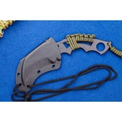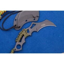 Modified Karambit – 8″ overall. 3 1/4″ blade. One piece black coated 440 stainless construction. OD green paracord wrapped handle. Black Kydex sheath with lanyard.