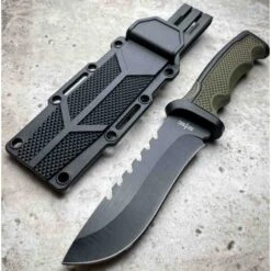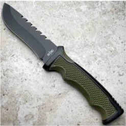 9″ (22.86cm) overall. 4.5″ (11.43cm) black finish sawback stainless blade. Black ABS handle with green rubber onlay. Black ABS belt sheath. Boxed.