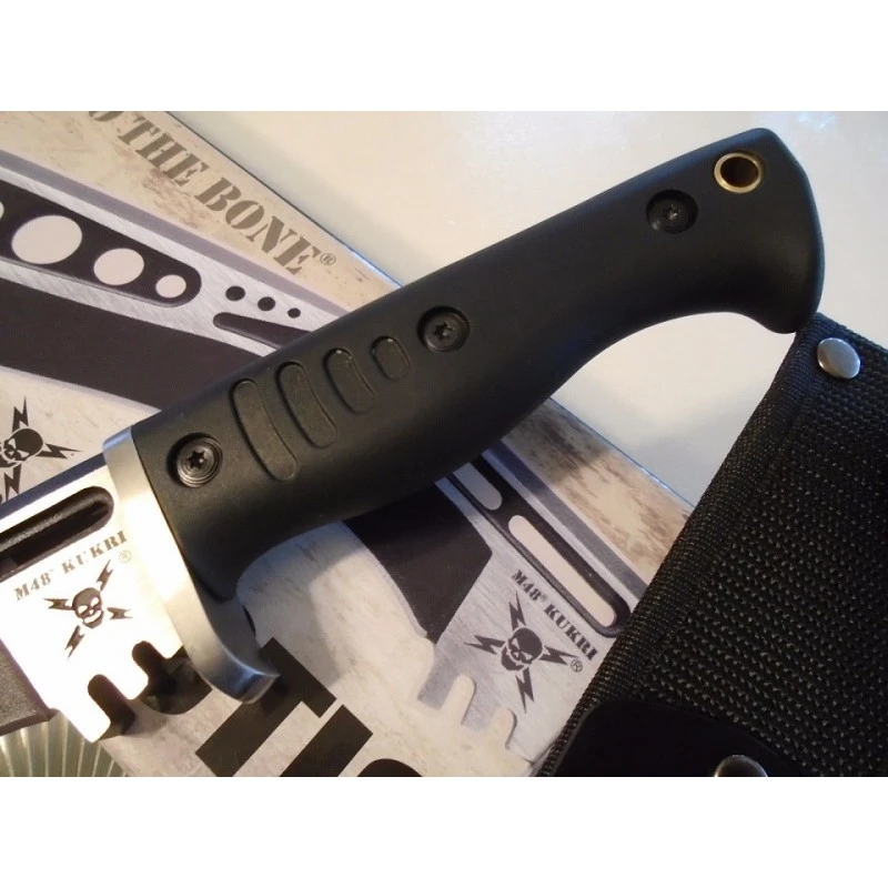Machette Gurkha United Cutlery M48 Kukri Ă lame fixe – Longueur totale 40.32cm – Longueur de lame 26.67cm – Construction d’une seule pièce full tang – Lame en acier 2Cr13 – Lame de type Kukri plain edge – Epaisseur de lame 5mm – Plaquettes du manche en TPR – Etui en fibre de nylon rigide