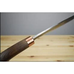 18.75″ (47.63cm) overall. 12″ (30.48cm) hammered finish 5160 carbon steel blade. Renewable eco wood handle. Copper bolster. Black nylon belt sheath. Boxed.