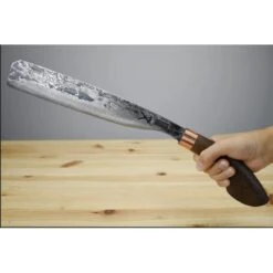 Longueur totale 47.63cm. Longueur de lame 30.48cm. Lame en acier carbone 5160. Dureté 55-60 HRC. Lame finition martelée. Manche en hêtre. Garde en cuivre. Etui nylon noir. Machette fabriquée en Malaisie.