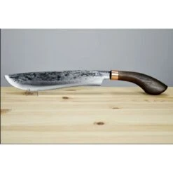 47.63cm overall. 30.48cm hand forged 5160 carbon steel blade. Renewable eco wood handle. Copper bolster. Black nylon belt sheath