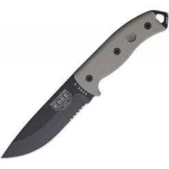 RC5SBK ESEE Survival – Escape – Evasion Knife. 10 7/8″ overall. 5 1/4″ 1095 carbon steel partially serrated blade with black powder coat finish. Full tang. Extended tang end can be used as a glass breaker. OD green canvas micarta handles. Black MOLLE compatible Kydex sheath.