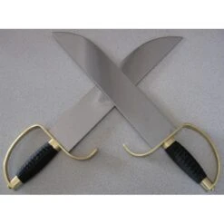 Cold Steel Butterfly Swords. Contains two 20 3/8″ overall swords with 14 7/8″ 1055 carbon steel blades. Hardwood handle with braided cord wrap. Brass finish D-shaped hand guard. Both store in leather scabbard.