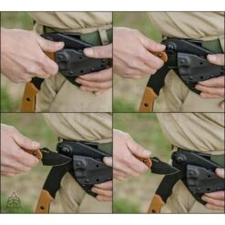 Tops Wolf Pax 2 Combo – 10 1/8″ overall. 4 7/8″ axe head with 3″ cutting edge, 1 7/8″ bottom cutting edge and lashing holes and slot. Full tang. Black traction coated 1095 high carbon steel construction. Tan canvas micarta handles. Lanyard hole with OD green nylon cord lanyard. Includes 5 1/8″ overall Wolf Pup with 2 3/8″ black traction coated 1095 high carbon steel blade with lashing holes and slot. Thumb ridge. Full tang. Tan canvas micarta handles. Lanyard hole. Black molded Kydex sheath with stainless clip holds both. TOPS survival whistle. Certificate of Authenticity. Bulk packed.
